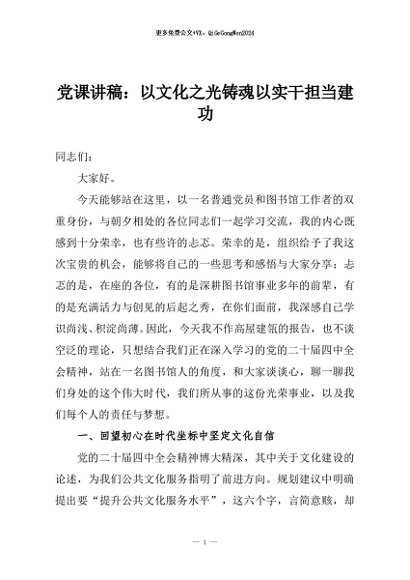 / 【七哥公文】2026年:党课讲稿:以文化之光铸魂以实干担当建功+更多免费公文+VX:QiGeGongWen2024