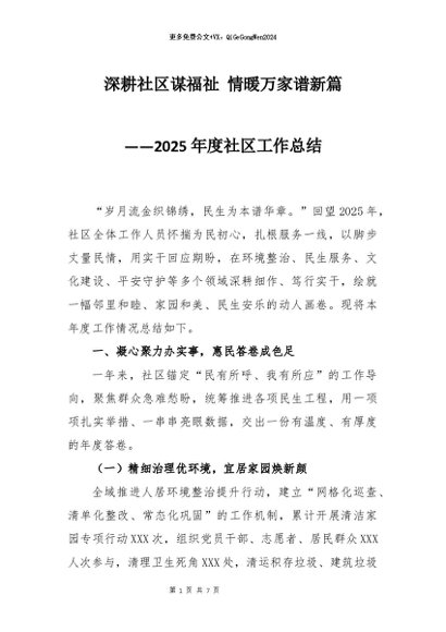 【七哥公文】2026年:2025年度社区工作总结:深耕社区谋福祉 情暖万家谱新篇+更多免费公文+VX:QiGeGongWen2024