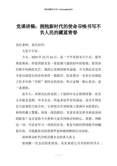 【七哥公文】2026年:党课讲稿:拥抱新时代的使命召唤书写不负人民的藏蓝青春+更多免费公文+VX:QiGeGongWen2024