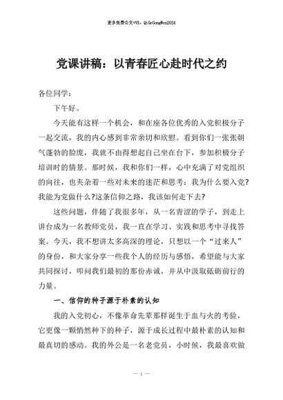 【七哥公文】2026年:党课讲稿:以青春匠心赴时代之约+更多免费公文+VX:QiGeGongWen2024