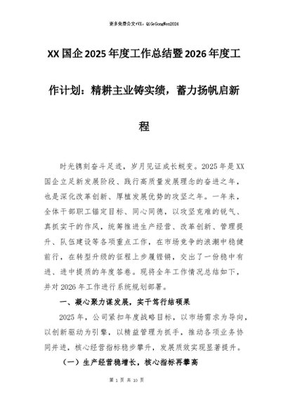 【七哥公文】2026年:XX国企2025年度工作总结暨2026年度工作计划:精耕主业铸实绩,蓄力扬帆启新程+更多免费公文+VX:QiGeGongWen2024