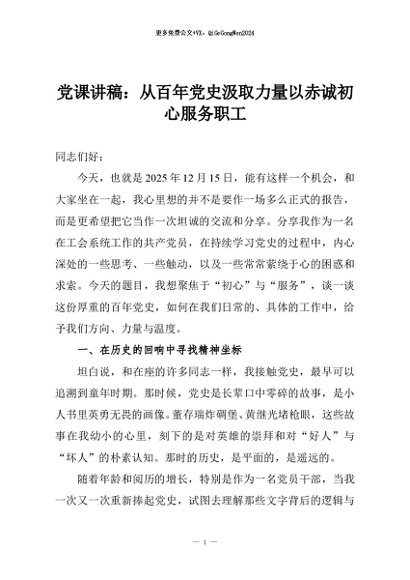 / 【七哥公文】2026年:党课讲稿:从百年党史汲取力量以赤诚初心服务职工+更多免费公文+VX:QiGeGongWen2024