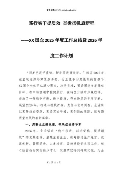 【七哥公文】2026年:XX国企2025年度工作总结暨2026年度工作计划:笃行实干提质效 奋楫扬帆启新程+更多免费公文+VX:QiGeGongWen2024