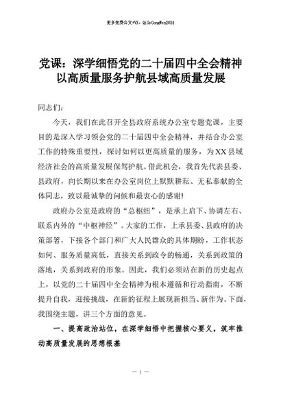 【七哥公文】2026年:党课:深学细悟党的二十届四中全会精神以高质量服务护航县域高质量发展+更多免费公文+VX:QiGeGongWen2024