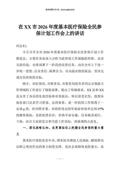 【七哥公文】2026年:在XX市2026年度基本医疗保险全民参保计划工作会上的讲话_副本+更多免费公文+VX:QiGeGongWen2024