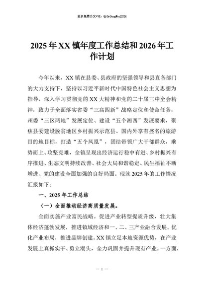 【七哥公文】2026年:2025年XX镇年度工作总结和2026年工作计划_副本+更多免费公文+VX:QiGeGongWen2024