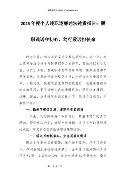 【七哥公文】2026年:2025年度个人述职述廉述法述责报告:履职践诺守初心,笃行致远担使命+更多免费公文+VX:QiGeGongWen2024