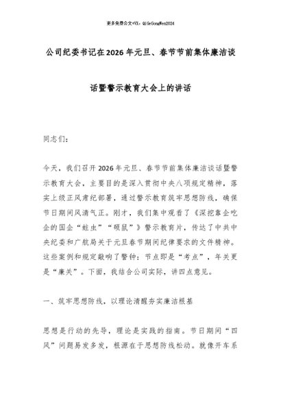 【七哥公文】2026年:公司纪委书记在2026年元旦、春节节前集体廉洁谈话暨警示教育大会上的讲话_副本+更多免费公文+VX:QiGeGongWen2024