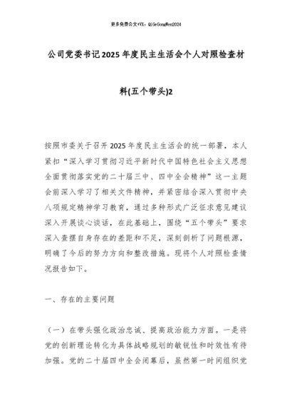 【七哥公文】2026年:公司党委书记2025年度民主生活会个人对照检查材料(五个带头)2_副本+更多免费公文+VX:QiGeGongWen2024