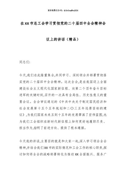 【七哥公文】2026年:在XX市总工会学习贯彻党的二十届四中全会精神会议上的讲话(精品)_副本+更多免费公文+VX:QiGeGongWen2024