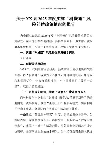 【七哥公文】2026年:关于XX县2025年度实施“科贷通”风险补偿政策情况的报告+更多免费公文+VX:QiGeGongWen2024
