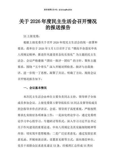 / 【七哥公文】2026年:关于2026年度民主生活会召开情况的报送报告+更多免费公文+VX:QiGeGongWen2024