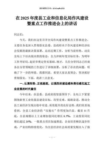 【七哥公文】2026年:在2025年度县工业和信息化局作风建设暨重点工作推进会上的讲话+更多免费公文+VX:QiGeGongWen2024