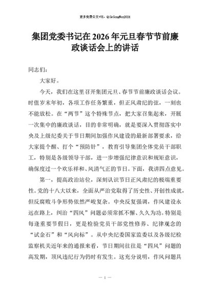 【七哥公文】2026年:集团党委书记在2026年元旦春节节前廉政谈话会上的讲话+更多免费公文+VX:QiGeGongWen2024