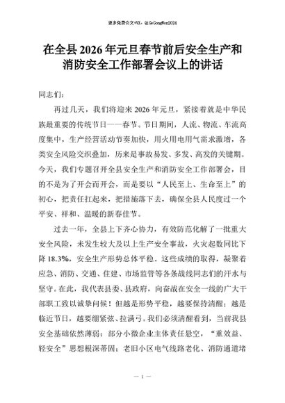 【七哥公文】2026年:在全县2026年元旦春节前后安全生产和消防安全工作部署会议上的讲话+更多免费公文+VX:QiGeGongWen2024