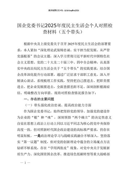 【七哥公文】2026年:国企党委书记2025年度民主生活会个人对照检查材料(五个带头)+更多免费公文+VX:QiGeGongWen2024