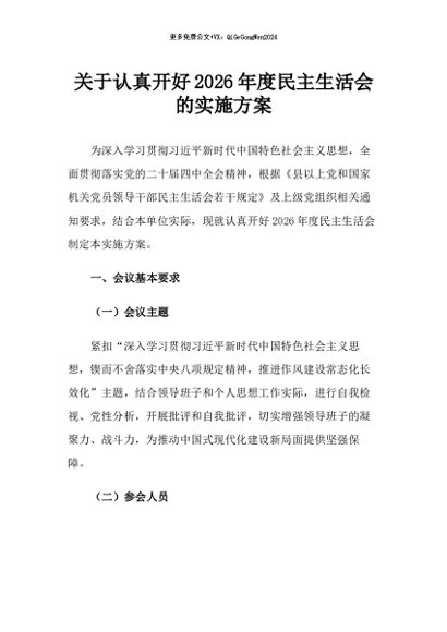 / 【七哥公文】2026年:关于认真开好2026年度民主生活会的实施方案+更多免费公文+VX:QiGeGongWen2024