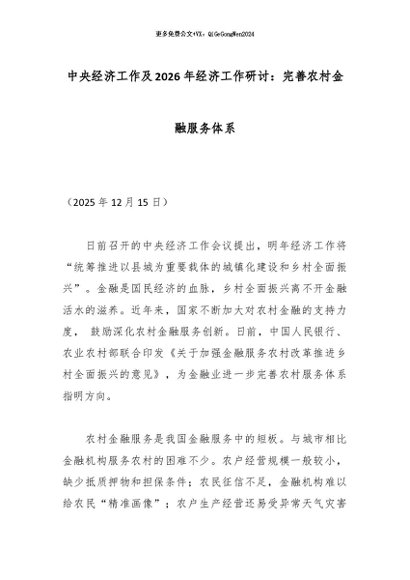 【七哥公文】2026年:中央经济工作及2026年经济工作研讨:完善农村金融服务体系_副本+更多免费公文+VX:QiGeGongWen2024