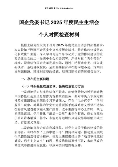 【七哥公文】2026年:国企党委书记2025年度民主生活会个人对照检查材料+更多免费公文+VX:QiGeGongWen2024