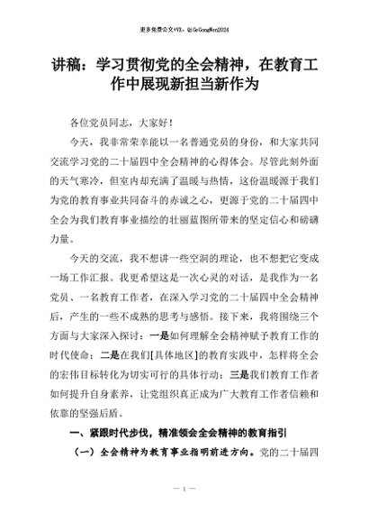 【七哥公文】2026年:讲稿:学习贯彻党的全会精神,在教育工作中展现新担当新作为+更多免费公文+VX:QiGeGongWen2024
