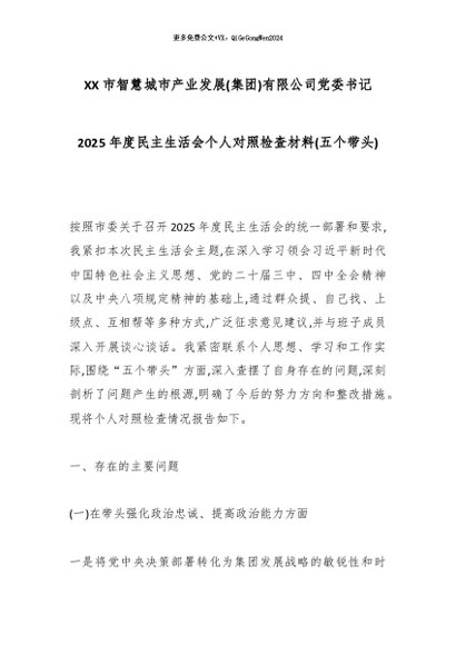 【七哥公文】2026年:XX市智慧城市产业发展(集团)有限公司党委书记2025年度民主生活会个人对照检查材料(五个带头)_副本+更多免费公文+VX:QiGeGongWen2024