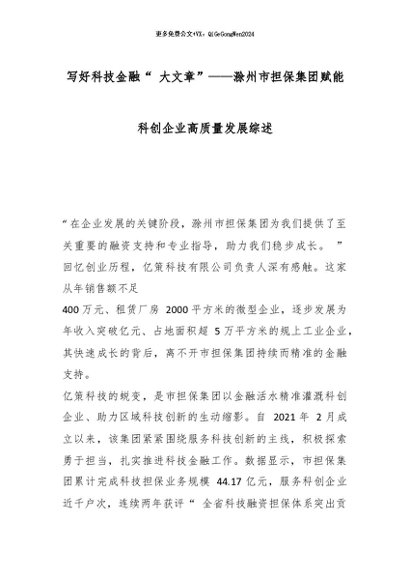 【七哥公文】2026年:写好科技金融“ 大文章”——滁州市担保集团赋能科创企业高质量发展综述_副本+更多免费公文+VX:QiGeGongWen2024