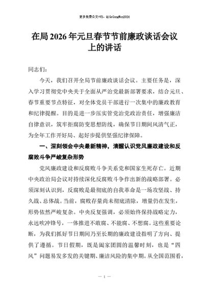 / 【七哥公文】2026年:在局2026年元旦春节节前廉政谈话会议上的讲话+更多免费公文+VX:QiGeGongWen2024