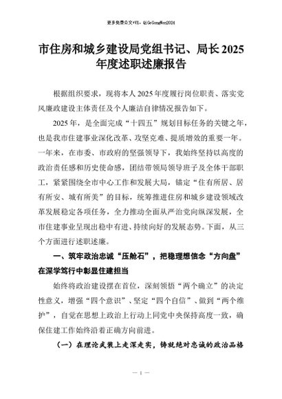 【七哥公文】2026年:市住房和城乡建设局党组书记、局长2025年度述职述廉报告_副本+更多免费公文+VX:QiGeGongWen2024