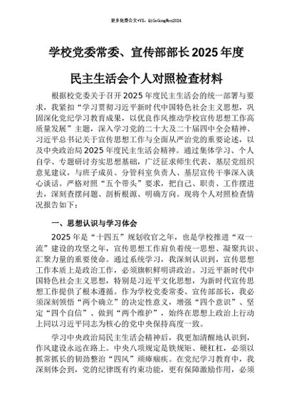 【七哥公文】2026年:学校党委常委、宣传部部长2025年度民主生活会个人对照检查材料_副本+更多免费公文+VX:QiGeGongWen2024