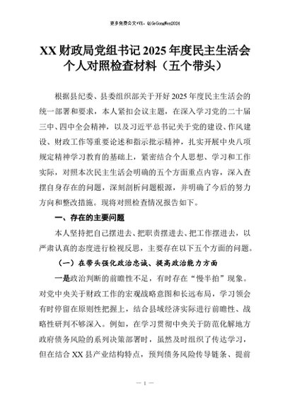 【七哥公文】2026年:XX财政局党组书记2025年度民主生活会个人对照检查材料(五个带头)_副本+更多免费公文+VX:QiGeGongWen2024