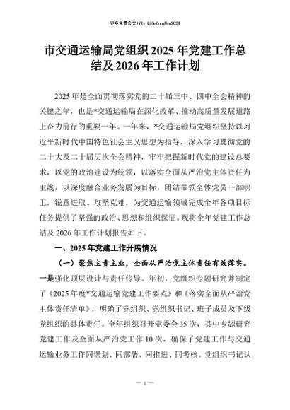 【七哥公文】2026年:市交通运输局党组织2025年党建工作总结及2026年工作计划_副本+更多免费公文+VX:QiGeGongWen2024