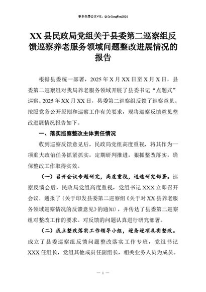 【七哥公文】2026年:XX县民政局党组关于县委第二巡察组反馈巡察养老服务领域问题整改进展情况的报告+更多免费公文+VX:QiGeGongWen2024