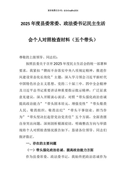 【七哥公文】2026年:2025年度县委常委、政法委书记民主生活会个人对照检查材料(五个带头)+更多免费公文+VX:QiGeGongWen2024