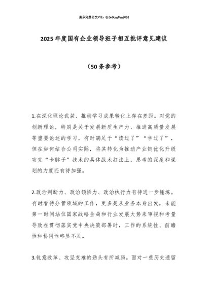 【七哥公文】2026年:2025年度国有企业领导班子相互批评意见建议(50条参考)_副本+更多免费公文+VX:QiGeGongWen2024