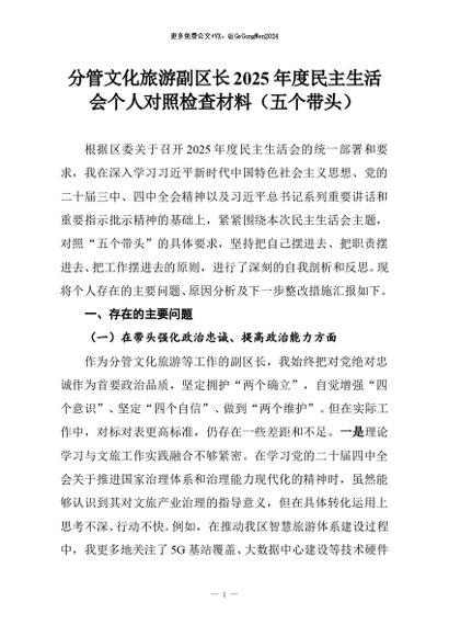 【七哥公文】2026年:分管文化旅游副区长2025年度民主生活会个人对照检查材料(五个带头)_副本+更多免费公文+VX:QiGeGongWen2024