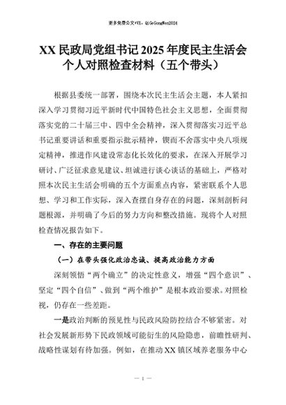 【七哥公文】2026年:XX民政局党组书记2025年度民主生活会个人对照检查材料(五个带头)_副本+更多免费公文+VX:QiGeGongWen2024