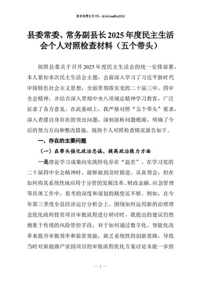 【七哥公文】2026年:县委常委、常务副县长2025年度民主生活会个人对照检查材料(五个带头)_副本+更多免费公文+VX:QiGeGongWen2024