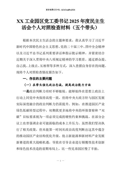 【七哥公文】2026年:XX工业园区党工委书记2025年度民主生活会个人对照检查材料(五个带头)_副本+更多免费公文+VX:QiGeGongWen2024