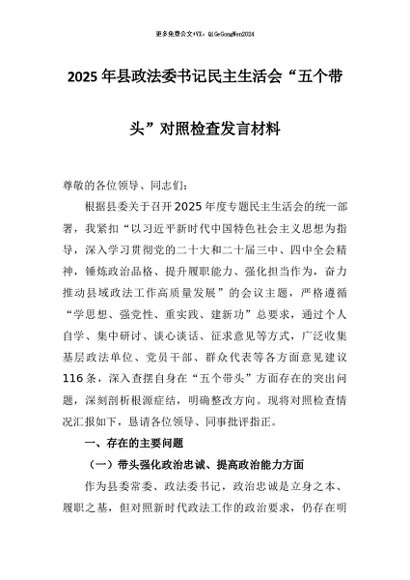 【七哥公文】2026年:2025年县政法委书记民主生活会“五个带头”对照检查发言材料+更多免费公文+VX:QiGeGongWen2024
