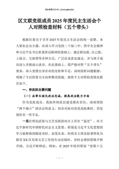 【七哥公文】2026年:区文联党组成员2025年度民主生活会个人对照检查材料(五个带头)_副本+更多免费公文+VX:QiGeGongWen2024