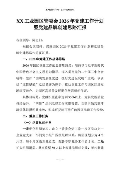 【七哥公文】2026年:XX工业园区管委会2026年党建工作计划暨党建品牌创建思路汇报_副本+更多免费公文+VX:QiGeGongWen2024