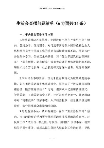 【七哥公文】2026年:生活会查摆问题清单(6方面共24条)+更多免费公文+VX:QiGeGongWen2024