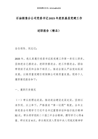【七哥公文】2026年:石油销售分公司党委书记2025年度抓基层党建工作述职报告(精品)_副本+更多免费公文+VX:QiGeGongWen2024
