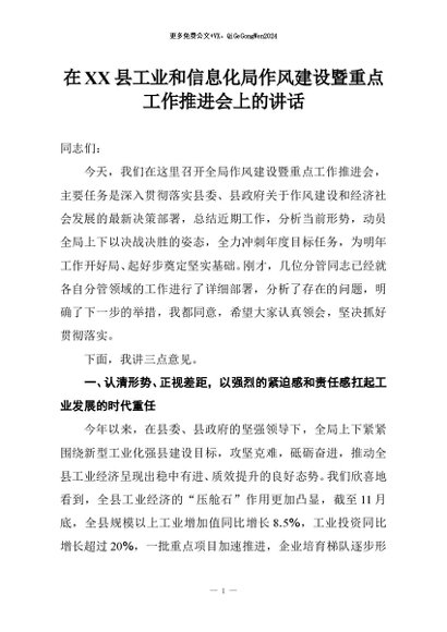 【七哥公文】2026年:在XX县工业和信息化局作风建设暨重点工作推进会上的讲话+更多免费公文+VX:QiGeGongWen2024