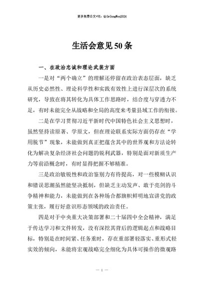 【七哥公文】2026年:生活会意见50条+更多免费公文+VX:QiGeGongWen2024