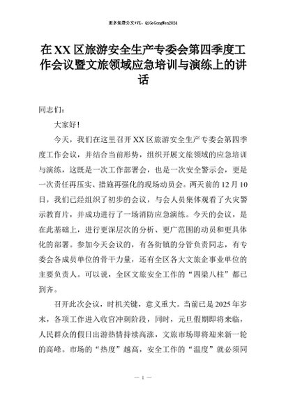 【七哥公文】2026年:在XX区旅游安全生产专委会第四季度工作会议暨文旅领域应急培训与演练上的讲话+更多免费公文+VX:QiGeGongWen2024
