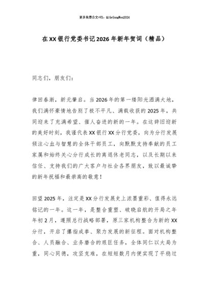 【七哥公文】2026年:在XX银行党委书记2026年新年贺词(精品)_副本+更多免费公文+VX:QiGeGongWen2024