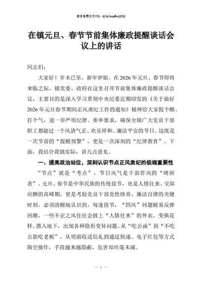 / 【七哥公文】2026年:在镇元旦、春节节前集体廉政提醒谈话会议上的讲话+更多免费公文+VX:QiGeGongWen2024