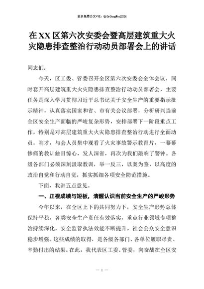 【七哥公文】2026年:在XX区第六次安委会暨高层建筑重大火灾隐患排查整治行动动员部署会上的讲话+更多免费公文+VX:QiGeGongWen2024