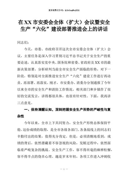 【七哥公文】2026年:在XX市安委会全体(扩大)会议暨安全生产“六化”建设部署推进会上的讲话+更多免费公文+VX:QiGeGongWen2024